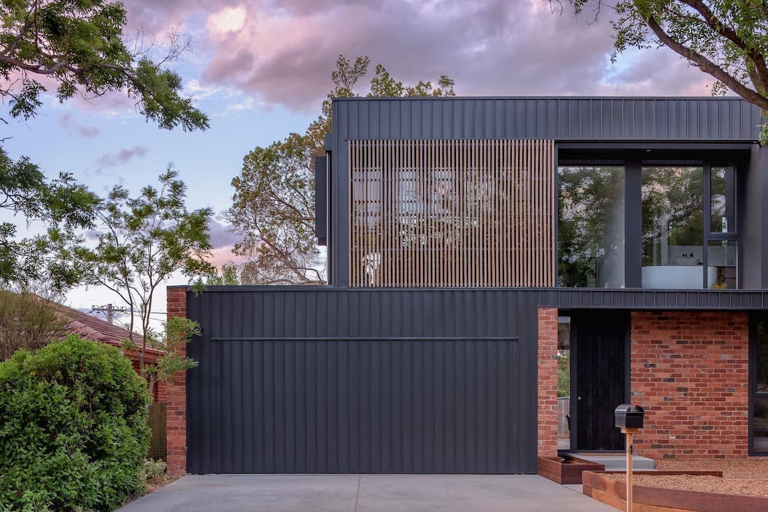 “The bricks are typical of early pre-war Canberra houses. The clients were keen to reflect this condition in their new house. The charcoal metal cladding provides a clear contrast to the red bricks and assists in articulating the folding metal ‘veil’. And the timber screens and eaves linings provide detail and warm textures.”