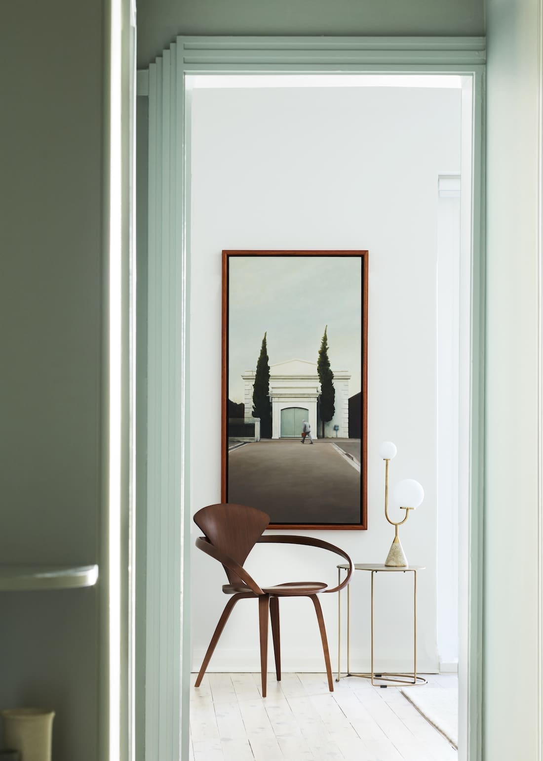 “The entry is moody and dark with no natural lighting. Rather than paint it white, we chose to embrace the moodiness and introduce the green reflecting the ocean hues, immersing the space in one single colour.”