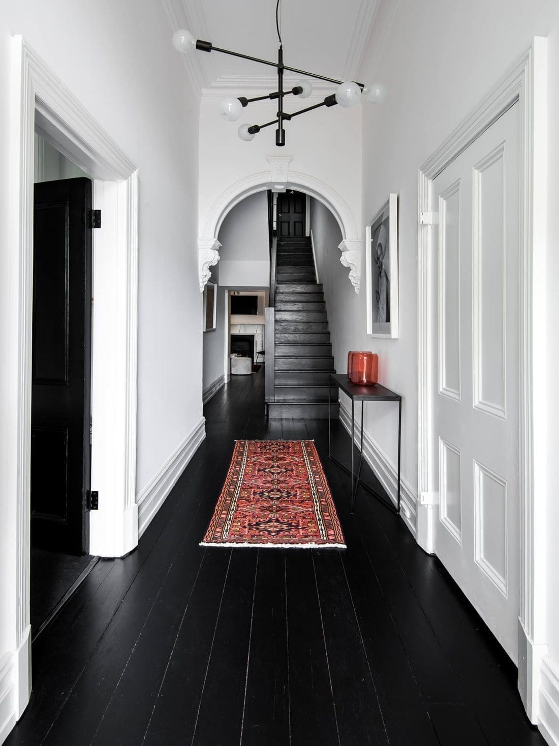 Black glossy timber floors are divine. They’re so versatile, as we can see in this modern heritage Victorian entrance; a chilled and pared back boho bedroom; or mis-matched eclectic space.