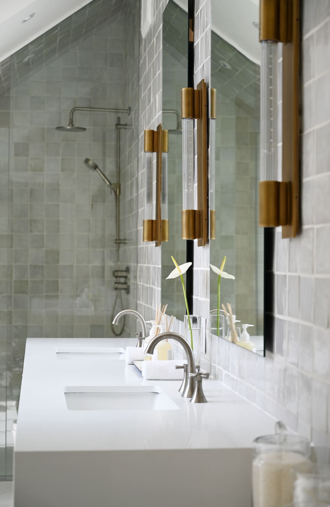 The luxe vibes continue in the spa-like bathroom with a windowed alcove housing a freestanding tub — yet another room with a view!