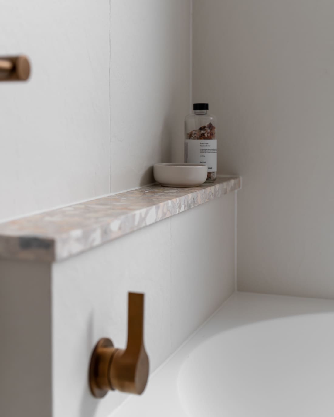 The hero of the bathroom is that dreamy materials palette. Peachy-pink terrazzo floor tiles, brushed bronze tapware and organic peach basin is a winning combo!
