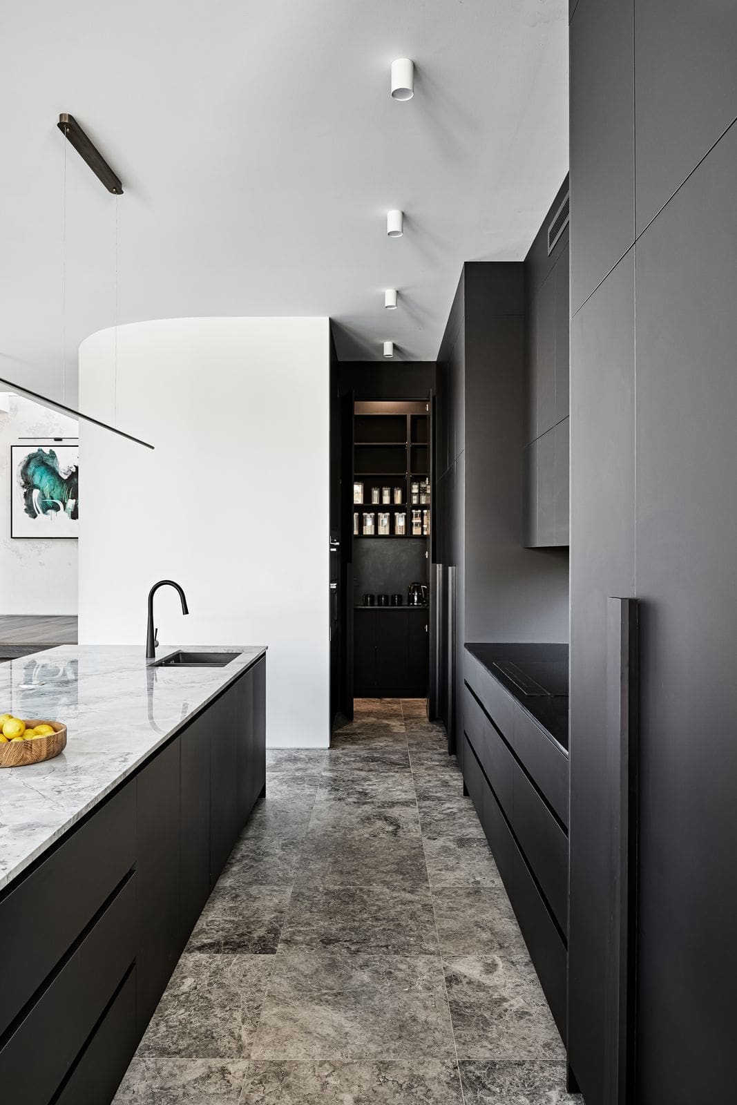 “The basis of this home was to give it a monochrome interior. To prevent it from feeling cold and stark, we included airy high ceilings, reams of natural light and warm timbers to offset the cool marble flooring.