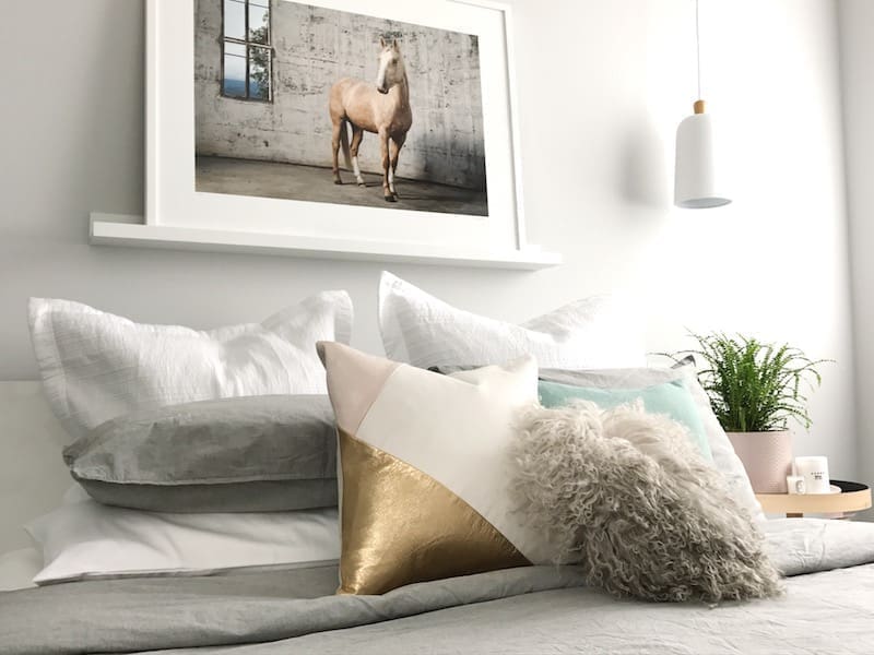 You don’t need to go overboard here but a hint of brass, gold or other metallic accent can catch the eye and signal luxury. We used a small amount on a feature cushion and on the side table. The shiny coat of the horse in the photographic print by Grace Costa also has a slightly bronzed sheen that works in this space.