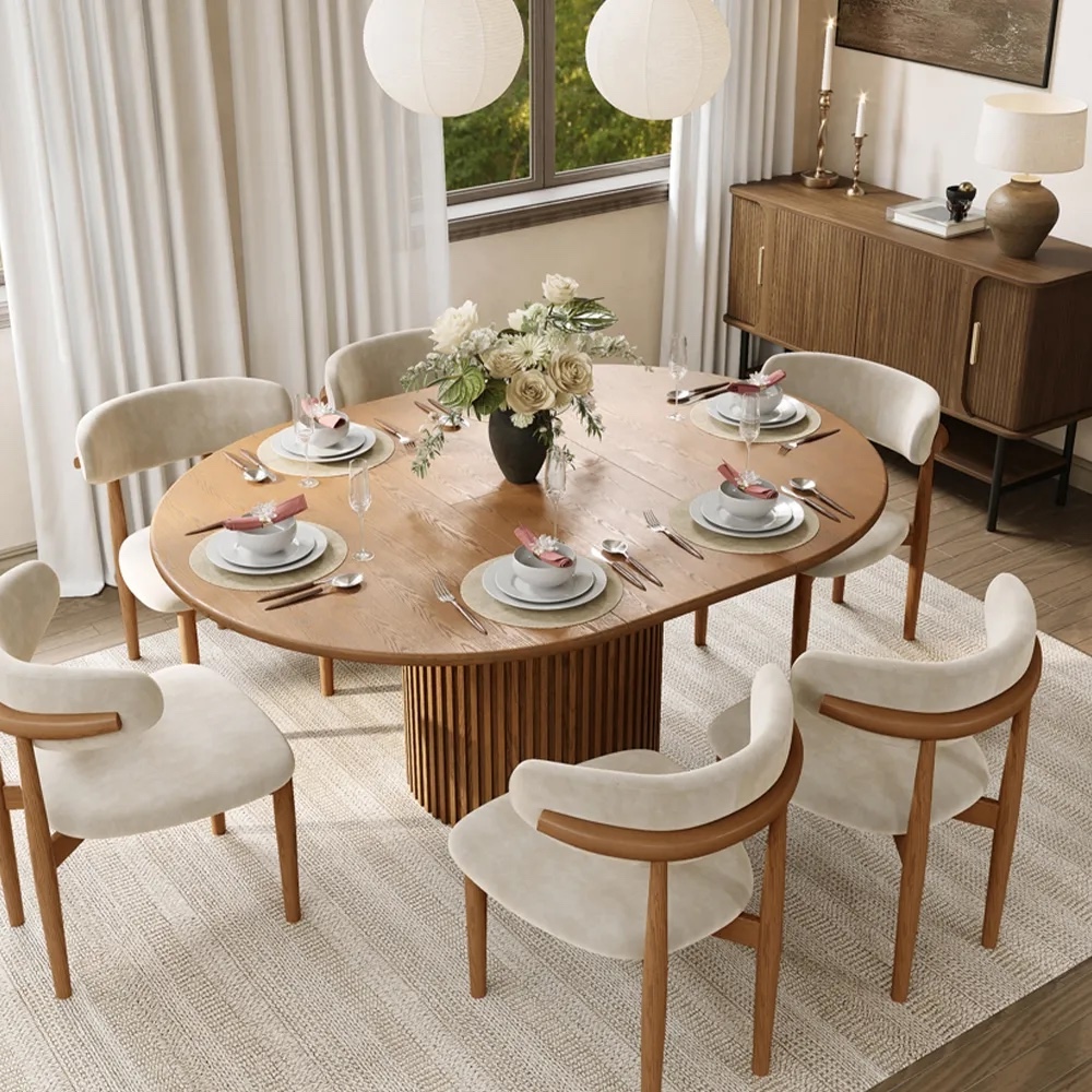 Timber remains the most popular choice in Australian homes and for good reason. This material brings warmth, texture, and a connection to natural materials that suits our relaxed aesthetic beautifully. Look for solid timber or quality timber veneer rather than MDF with a timber-look finish, which tends to show wear much faster. If your dining table is exposed to direct sunlight, cheaper MDF dining tables can also warp, peel and discolour. Round or oval extensions work particularly well in open-plan layouts as they soften the visual weight of a large table.