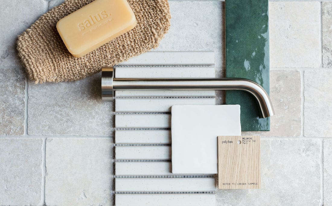 In the flatlay below, I’ve paired the ‘Vivid Slimline Curved Spout’ in brushed nickel with earthy tiles (travertine is coming through as a popular material) and timber accents.