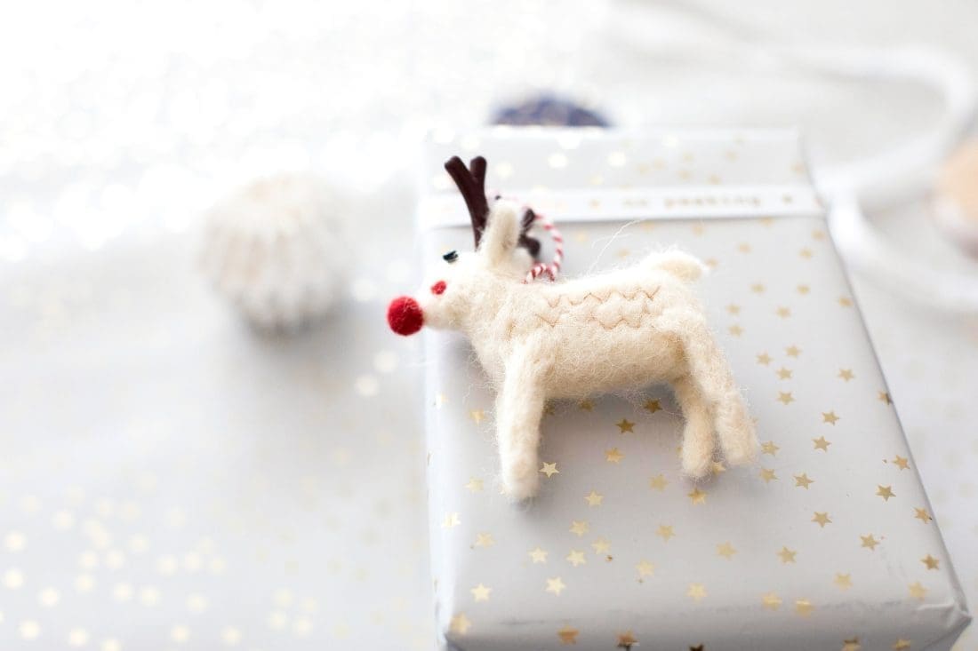 A seriously cute way of wrapping your gift is to add a sweet ornament on top, such as this felt Rudolf ornament. It’s kind of like giving two gifts in one as they can keep the ornament to hang on their tree afterwards!