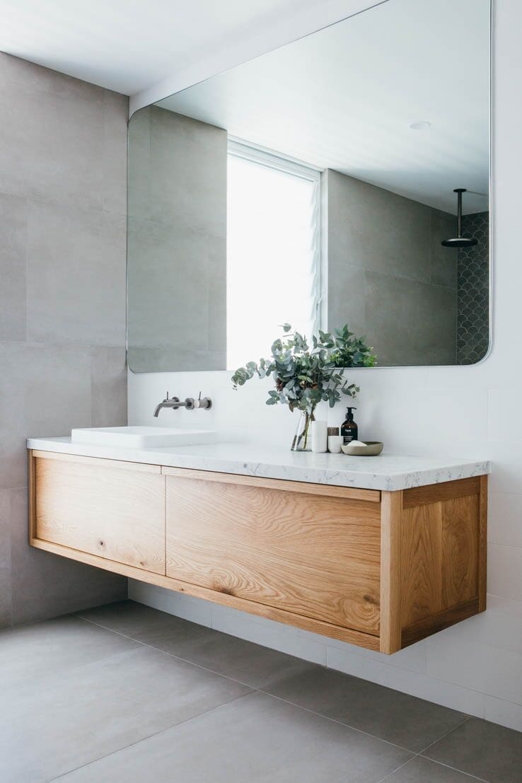The accents of American oak around the room — with the large beam and vanity — are so beautiful and pick up on the tones of the large format tiles that they wrapped around all the walls and floor.