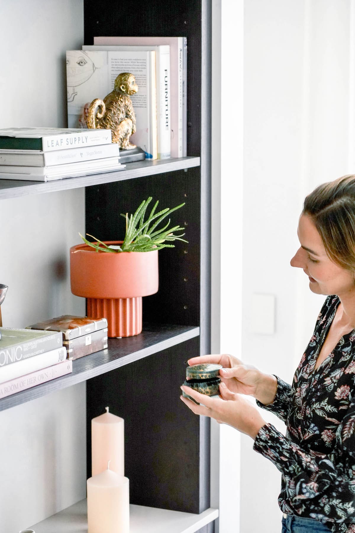 For example, in the bookshelf I used repetition of brass accents through the metal sculpture and bookend, wooden trinket box and even the spine of a book. These brass accents achieve a cohesive while unifying old and new.