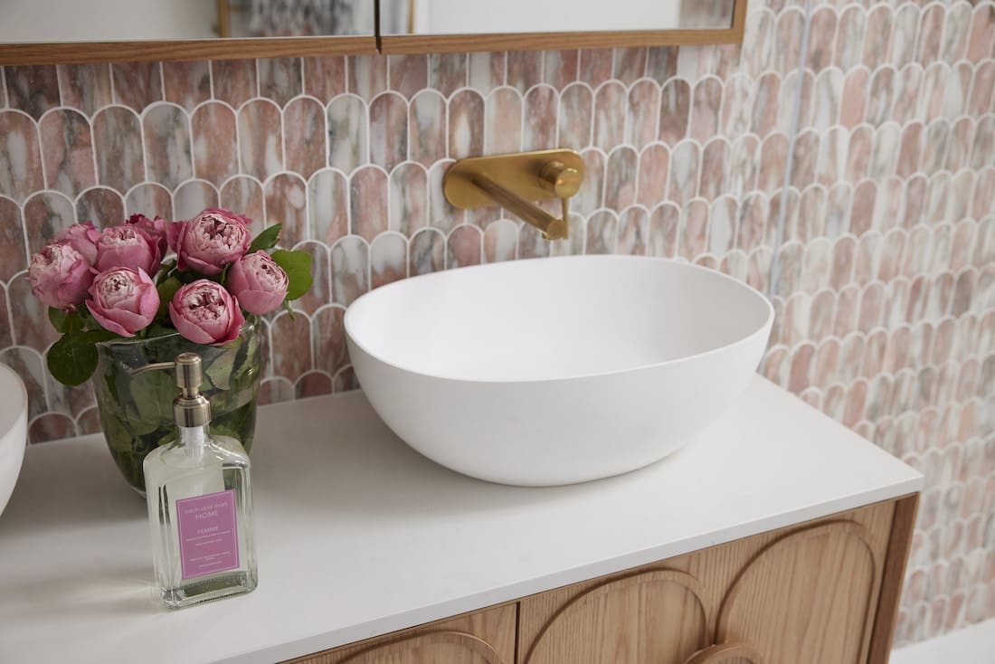 As much as we love that rose marble paddle-pop mosaic, less is more. We would have pulled things back, possibly just running it up the wall behind the vanity. The shower screen provides the perfect break to transition to a different tile. With the shift towards warmer and earthier tones, we also felt a less-stark floor and wall tile would have been more successful. And haven’t we all agreed it’s time to let go of using a feature tile in a niche?