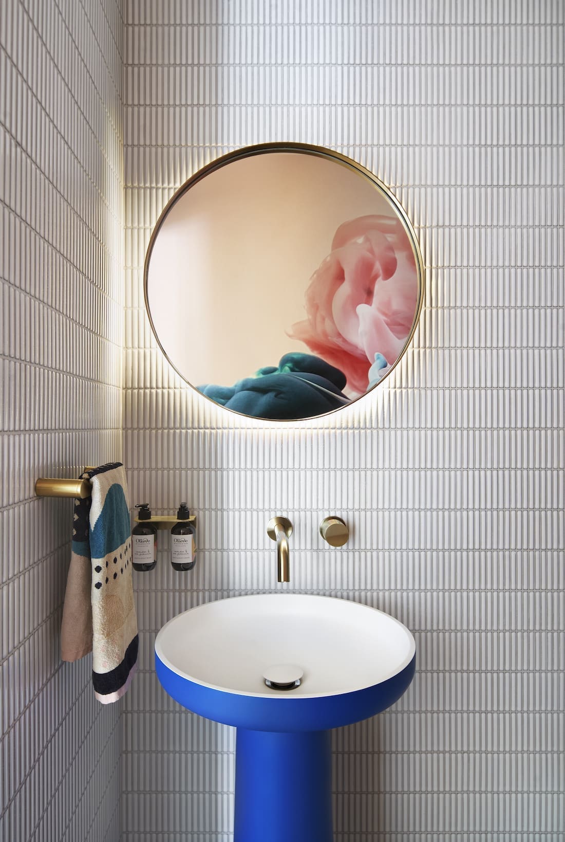 There are vibrant pops of colour (like that blue pedestal sink!) throughout the home, and yet it manages to stay tonal and cohesive throughout.